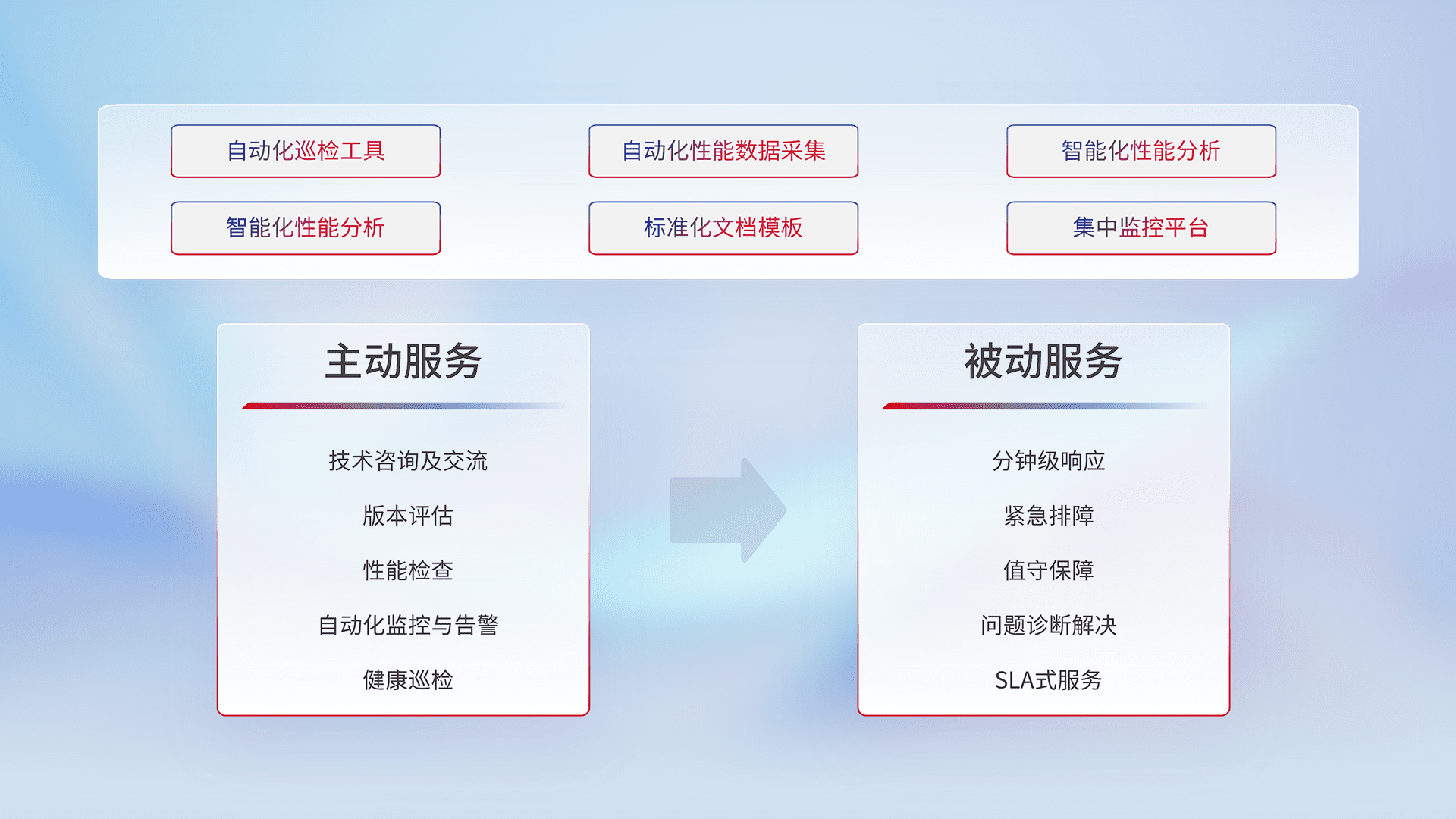 智能化工具和标准化文档,,保障服务质量,,提供主动服务(包含技术咨询、、、、版本评估、、性能检查、、、自动化监控与告警、、健康巡检)和被动服务包含(分钟级响应、、、、紧急排障、、值守保障、、、、问题诊断解决、、、、SLA服务)。。。。
